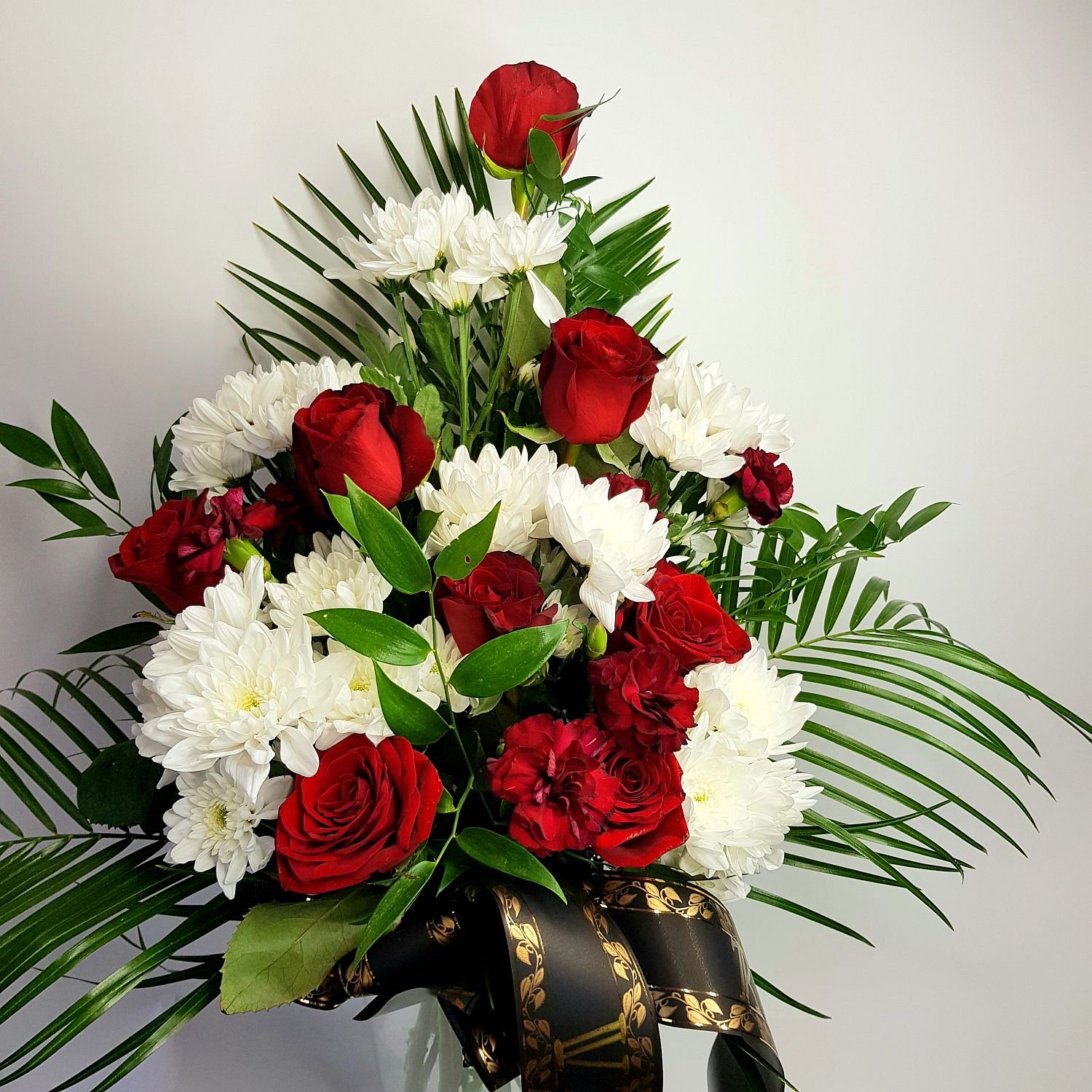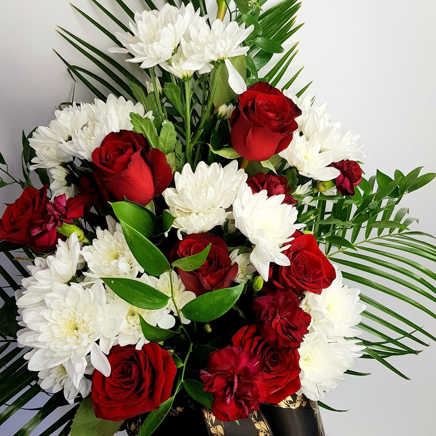 Smuteční kytice vázaná v ruce číslo 21. je tvořena z červených růží, bílých chrysanthém a vínových karafiátů. Květy jsou doplněné zelení a smuteční stuhou s nápisem dle Vašeho přání.