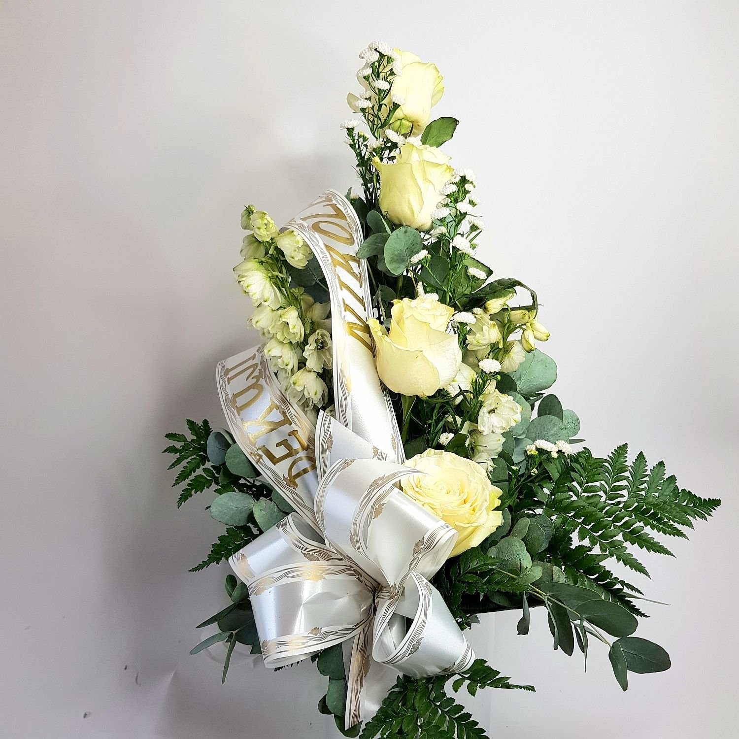 Smuteční kytice vázaná v ruce číslo 17. je tvořena z bílých růží, které jsou doplněné bílými květy, zelení a smuteční stuhou s nápisem dle Vašeho přání.