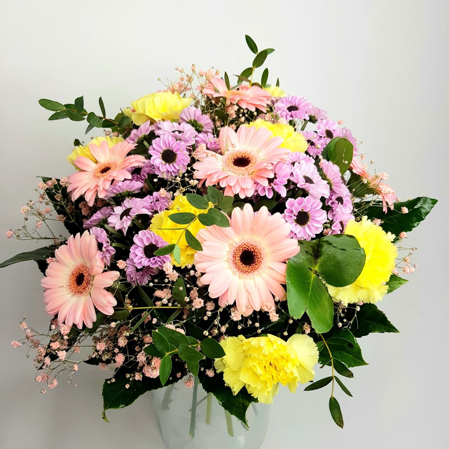 Kytice Magdaléna je tvořena z růžových gerber, žlutých karafiátů a růžových chr. santina. Květy jsou doplněné gypsophilou a zelení.