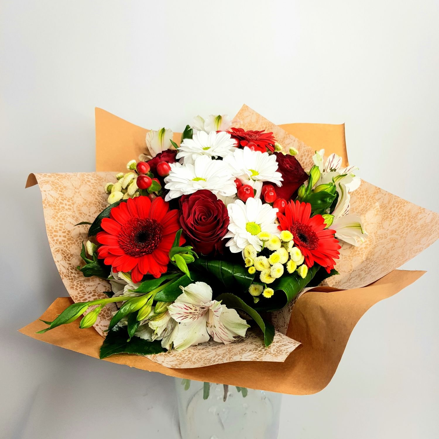 Kytice Bohdana je tvořena z červených minigerber, červených růží, hypericem, bílou chrysanthémou, světlých alstromerií a tanacethem. Květy jsou přizdobené zelení a manžetou.