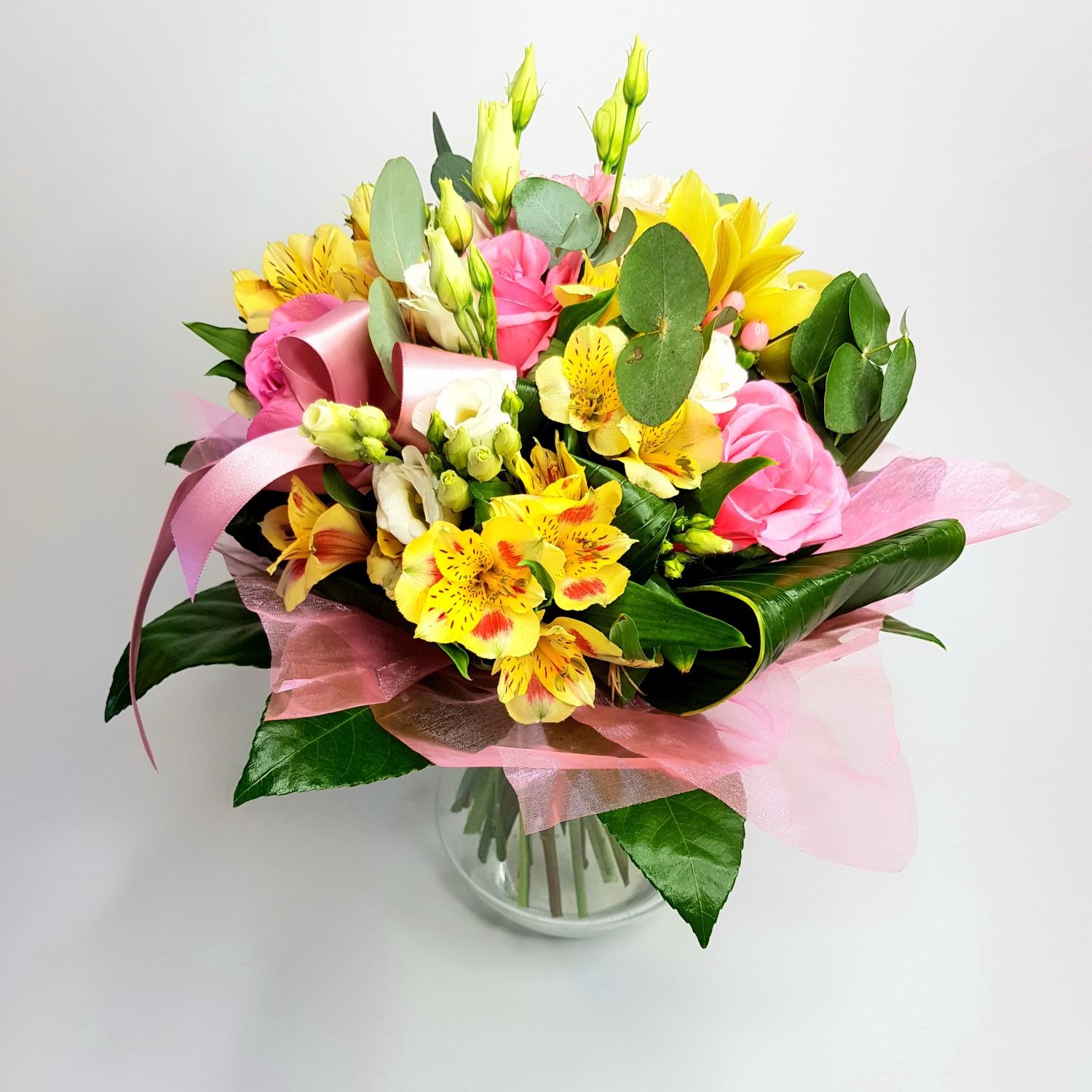 Dárková kytice Slavěna je tvořena z růžových růží, žlutých alstromerií, bílé eustomy a hyperica. Květy jsou doplněné zelení, stuhou a manžetou. Tato romantická dárková kytice se hodí jak pro slečnu tak pro dámu.