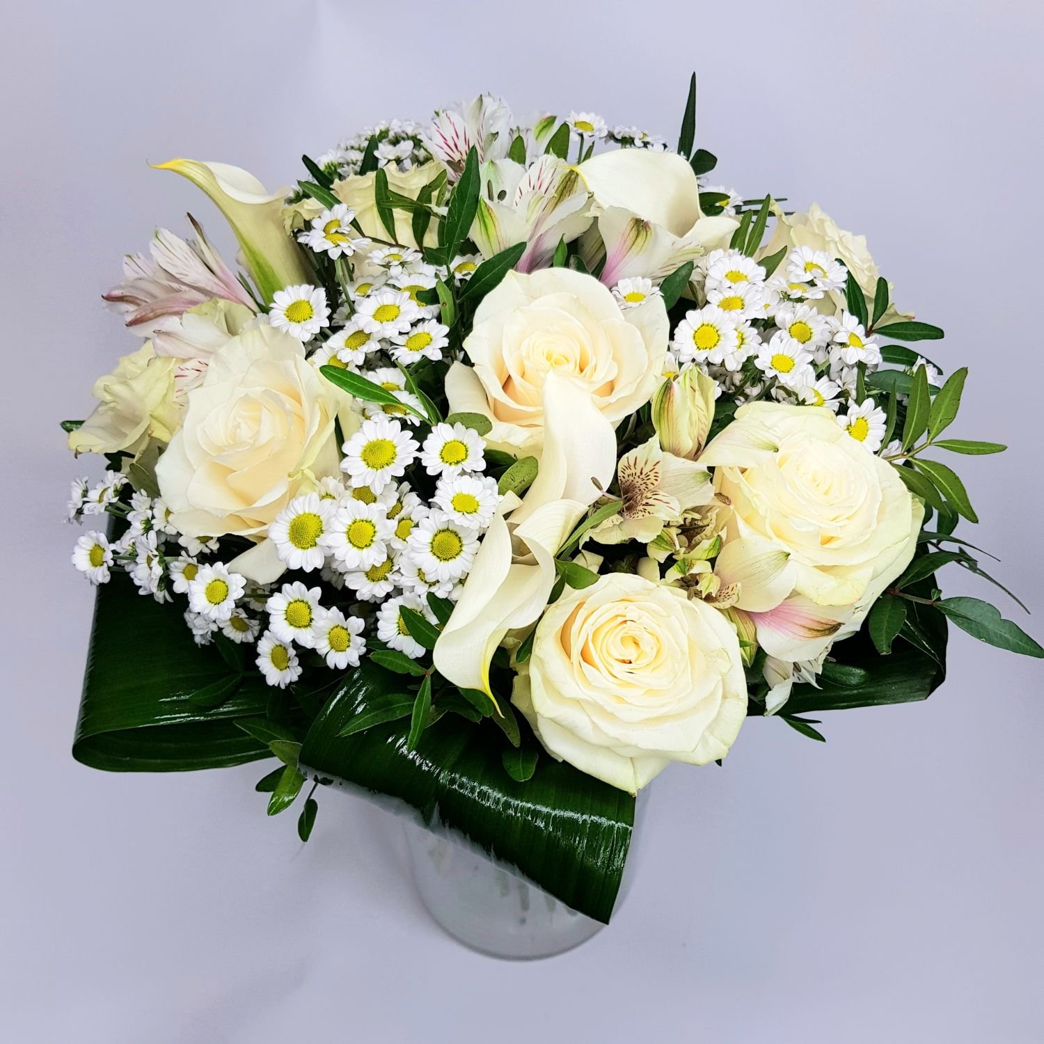 Kytice Klára je tvořena z bílých růží, bílých kal, bílých alstromerií a bílých santínek. Květy jsou přizdobené dekorativní zelení.