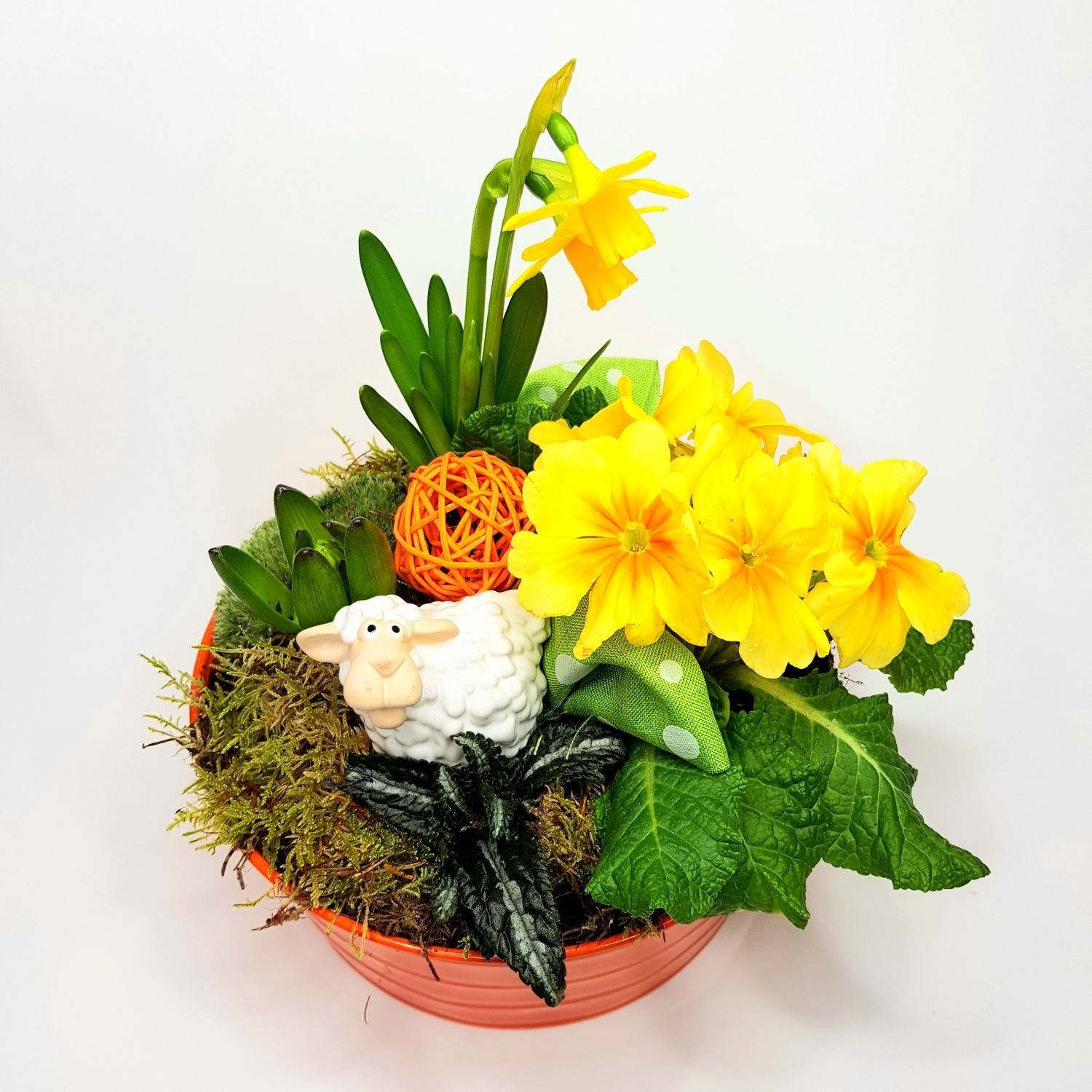 Jarní a Velikonoční sesazovaná mísa č. 30 je tvořena z hrnkových rostlin jako je např. narcis, primule a hyacint. Rostliny jsou přizdobeny keramickou dekorací, mechem a stuhou.