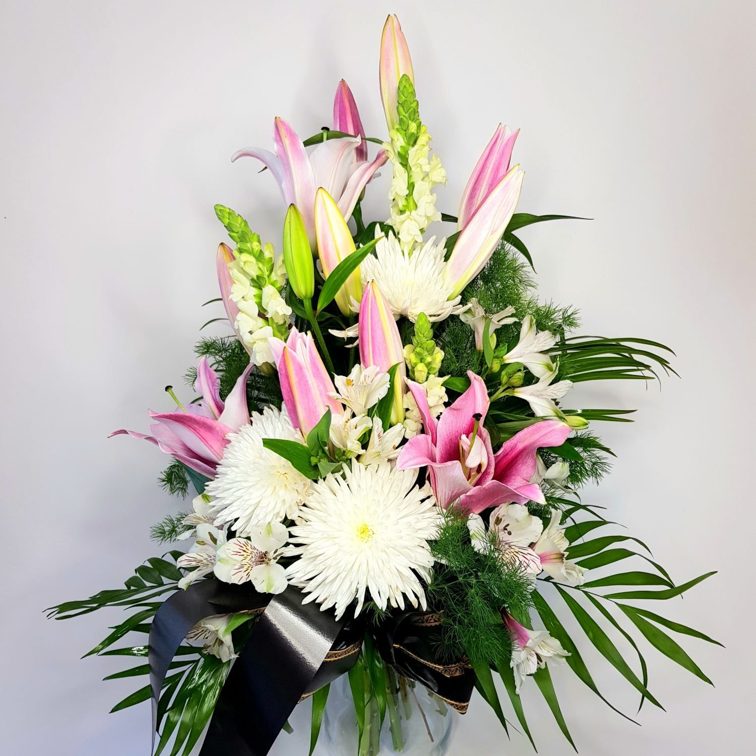 Smuteční kytice vázaná číslo 31. je tvořena z růžových lilií, bílých chrysanthém, bílých alstromerií a bílého hledíku. Květy jsou doplněny zelení a smuteční stuhou s nápisem dle Vašeho přání.