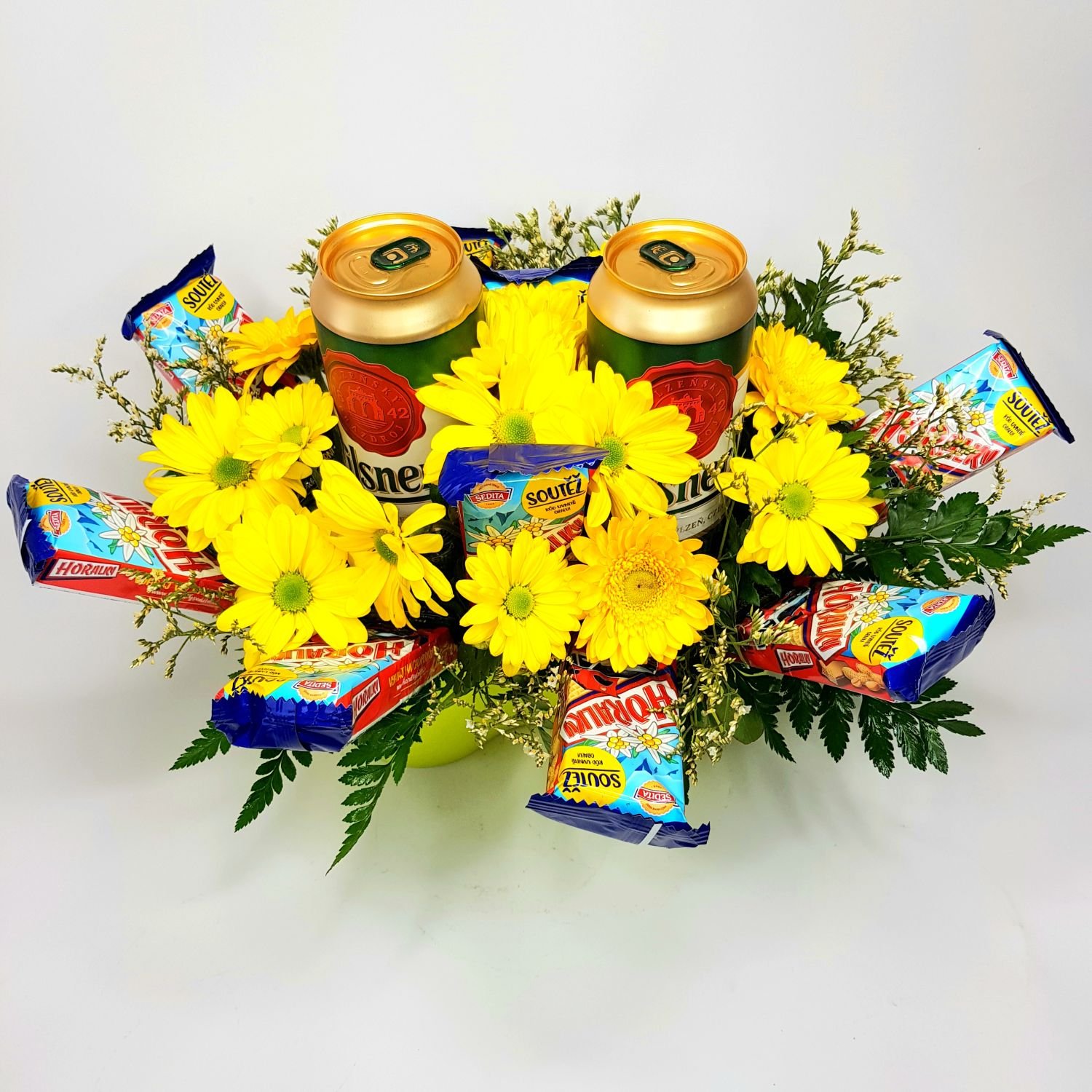 Aranžmá Luboš je tvořeno plechovkami piva Plzeň a horalkami. Dále jsou v aranži žluté chrysanthémky, limonium a zeleň. Vše je naaranžované do okrasného obalu.