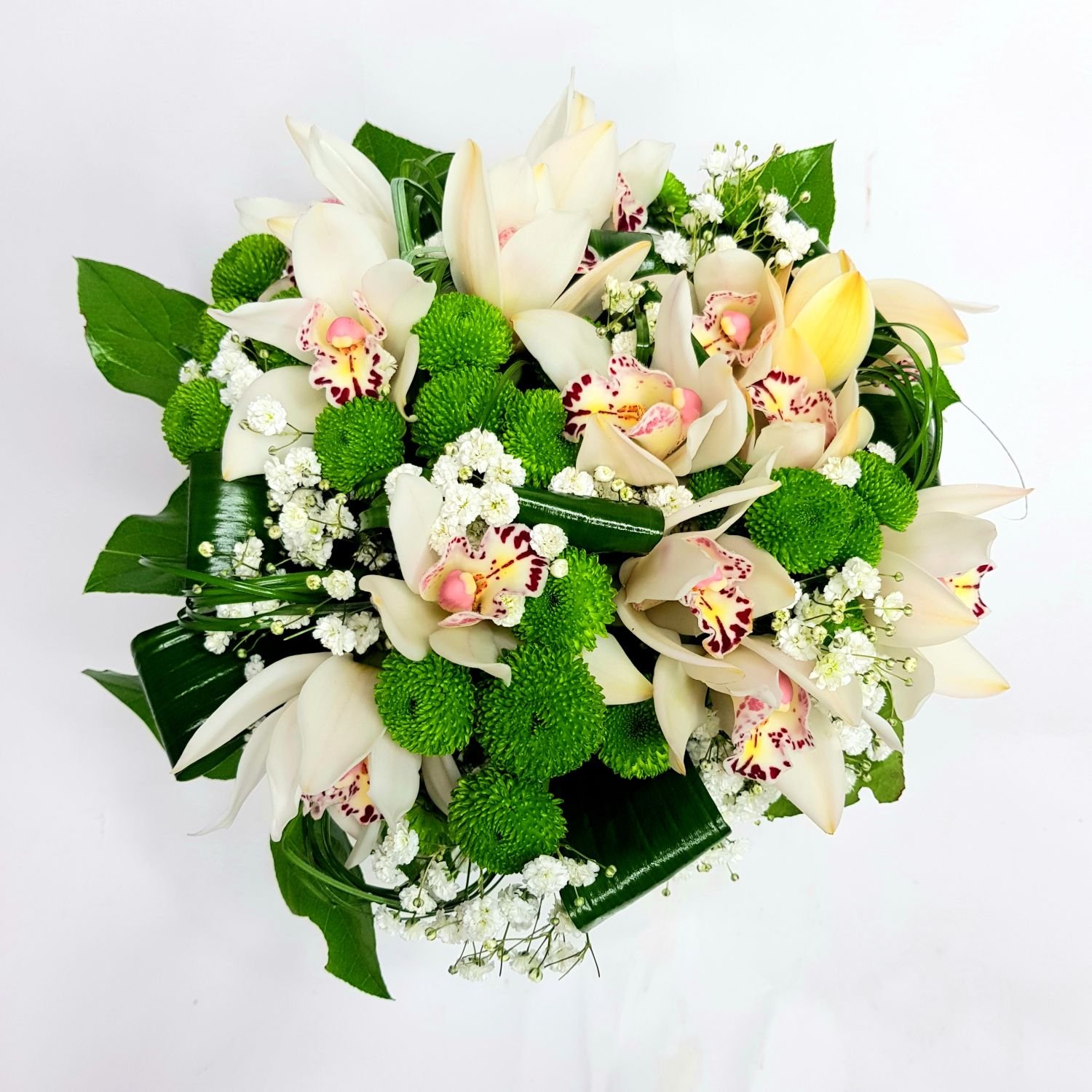 Kytice Bohuslava je tvořena z květů orchideje Cymbidium, zelených chrysanthém a gypsophilou.