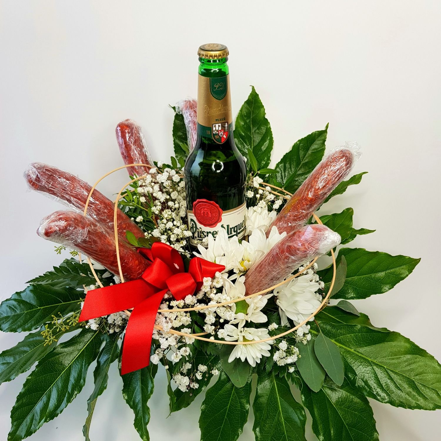 Aranžmá Albert je tvořeno z lahvového piva a klobás. Vše je doplněno květy a mašlí. Touto dárkovou vypichovanou kyticí potěšíte každého muže.