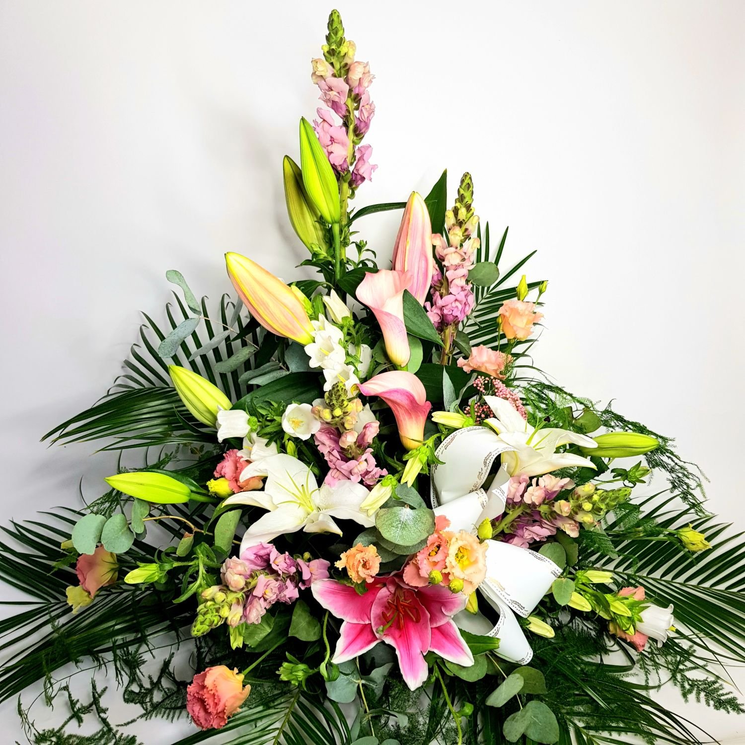 Smuteční kytice vypichovaná číslo 4. je tvořena z bílých a růžových lilií, růžových kal, růžových hledíků, růžové eustomy, bílé campanuli,doplňkovou zelení, černou stuhou s nápisem dle Vašeho přání. Kytice je vypichovaná do držáku Oasis, který má v sobě vodu a proto kytice déle vydrží. Tato kytice se používá místo věnce.