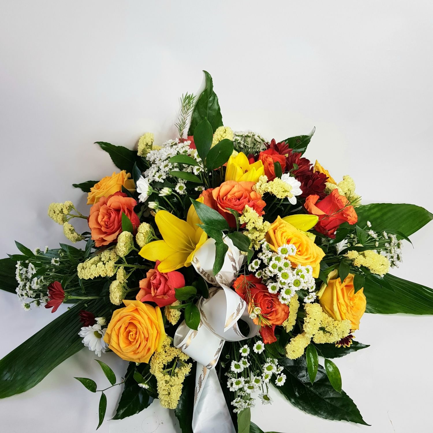 Smuteční kytice vypichovaná číslo 5. je tvořena ze žlutých a oranžových růží, žlutých lilií, bílých a vínových chrysanthém, žlutou staticí, doplňkovou zelení a černou stuhou a nápisem dle Vašeho přání. Tato kytice je vypichovaná do držáku Oasis, který má v sobě vodu a proto déle vydřží. Kytice se používá místo věnce.
