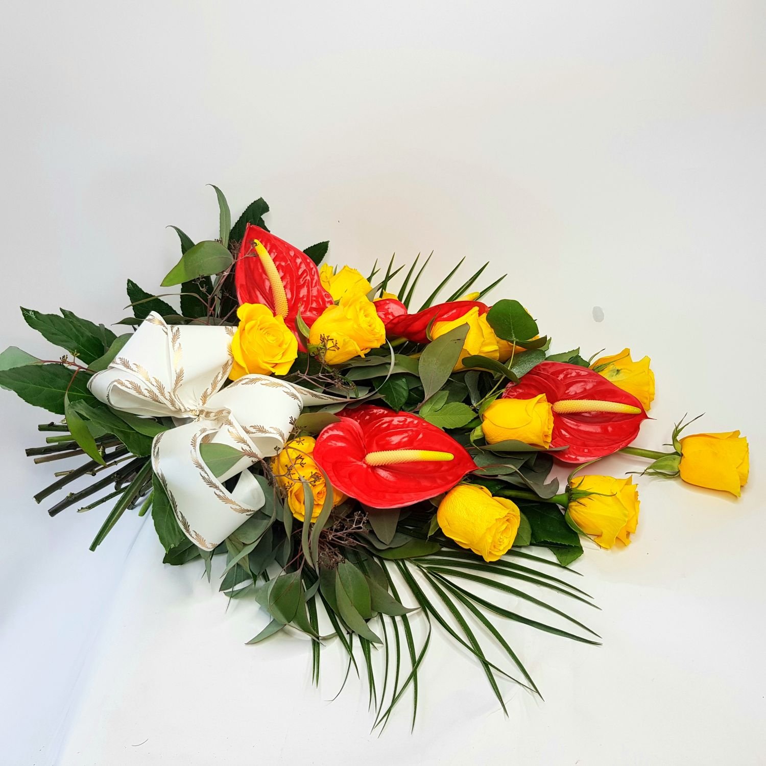 Smuteční kytice vázaná číslo 33. je tvořena z červených anthurií a žlutých růží. Květy jsou doplněné zelení a smuteční stuhou s nápisem dle Vašeho přání.