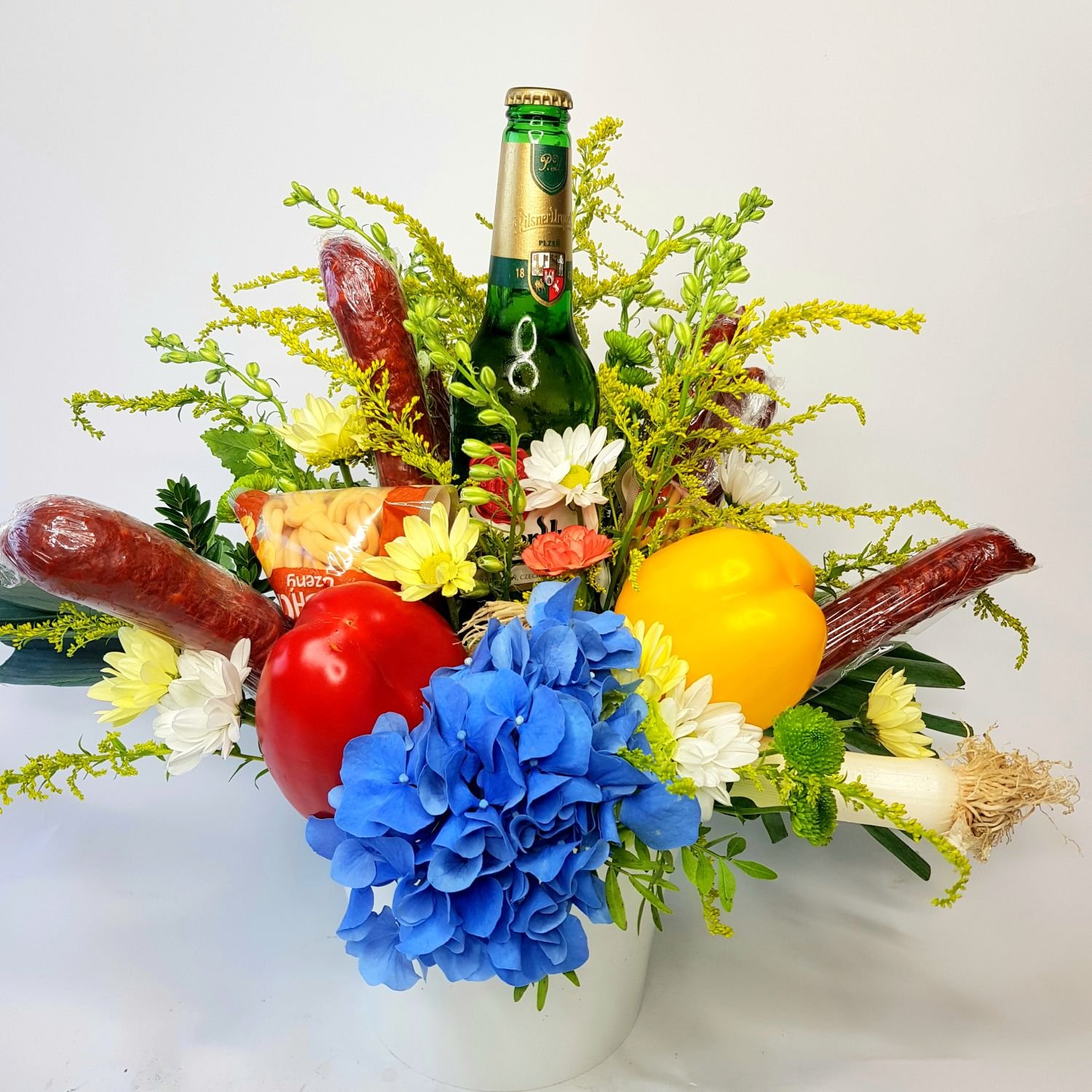 Vypichované aranžmá Jaromír je určena např. pro pány, kteří mají rádi pivčo a dobré klobásky. Vše je doplněno květy a zeleninou Vše je vypichované do okrasného obalu, ve kterém je umístěná hmota, která je nasáklá vodou a proto květy dlouho vydrží.