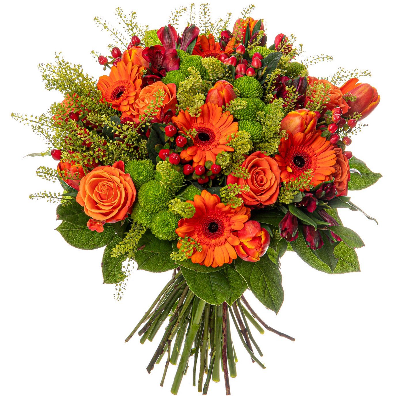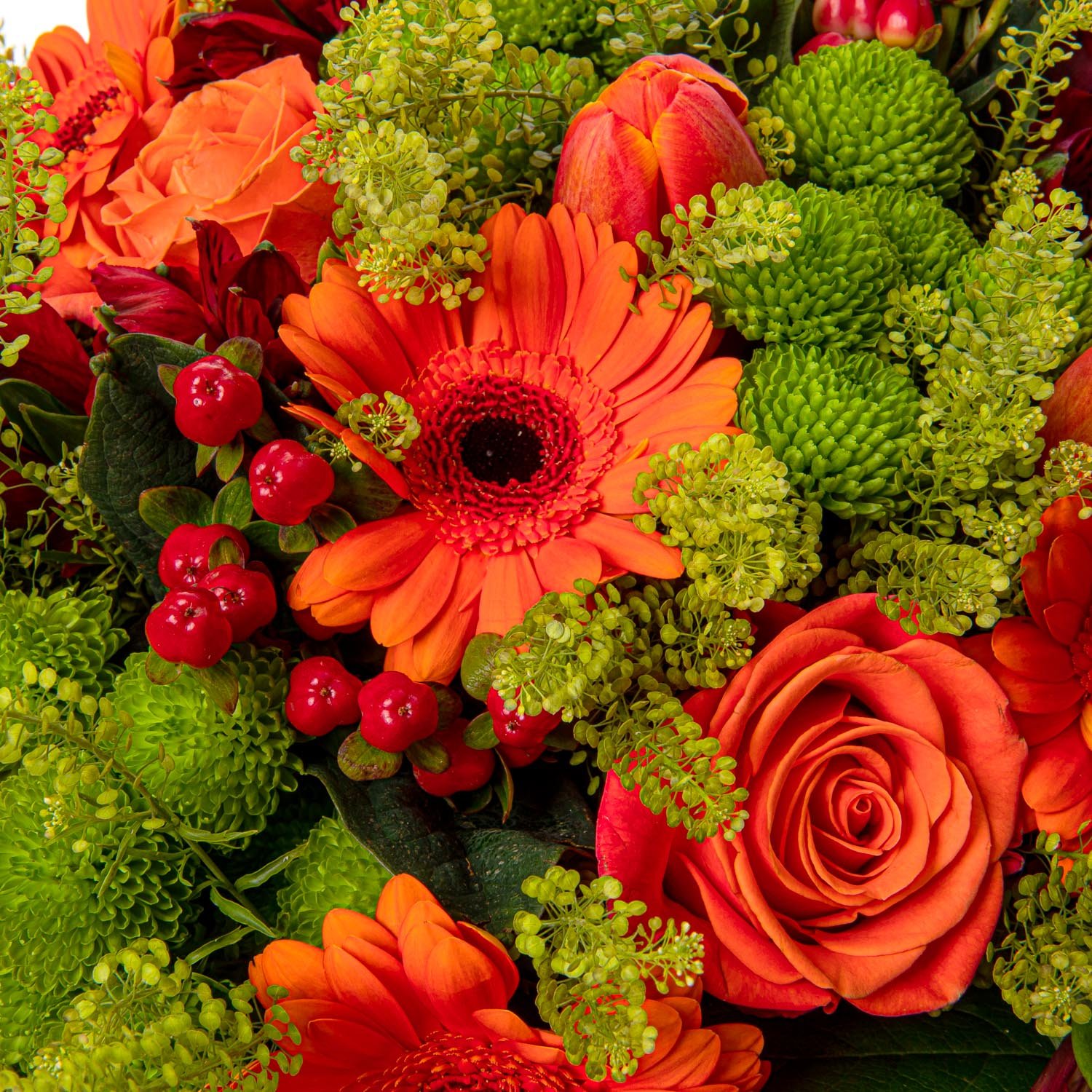 4 ks gerbera mini oranžová, 3 ks santini, 4 ks alstromerie červená, 5 ks růže oranžová, 3 ks hypericum, 5 ks tulipán oranžový a dekorativní zeleň (pistacie, salal)
