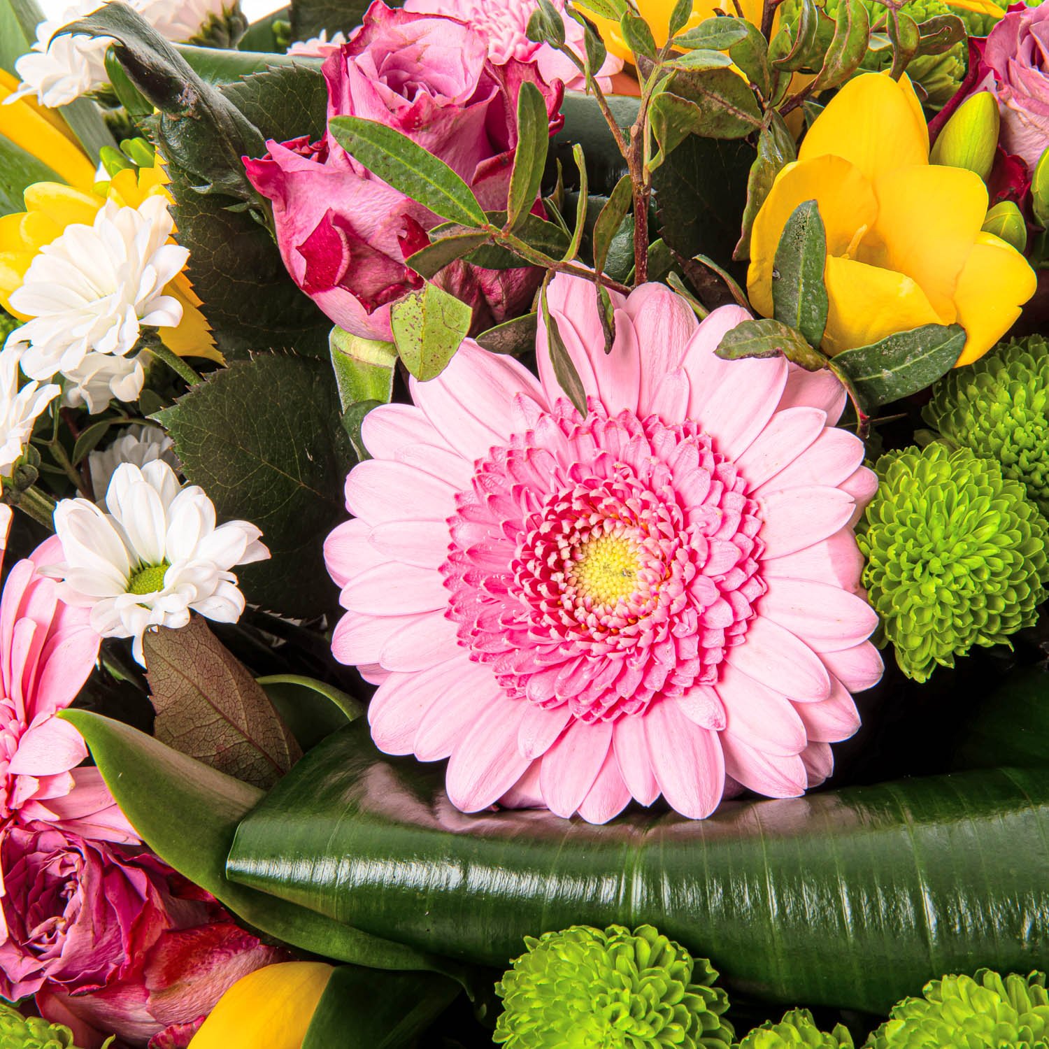 5 ks růže fialová/růžová, 5 ks gerbera mini růžová, 4 ks santini zelená, 4 ks santini bílá, 4 ks frésie, 7 ks tulipán žlutý a dekorativní zeleň (aspidistra, rumora, pistacie)
