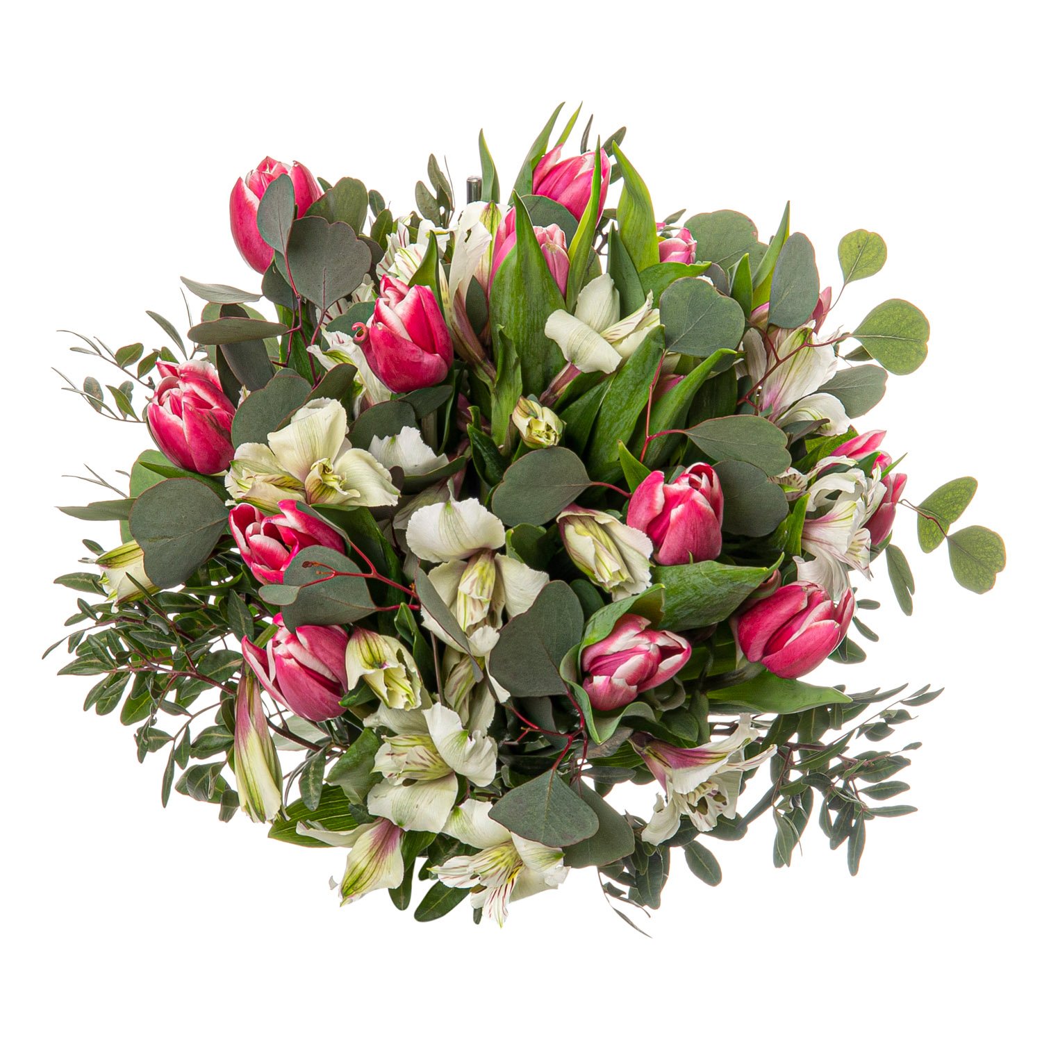 Exkluzivní 15 ks tulipán, 7 ks alstromerie, eucalyptus a dekorativní zeleň (pistacie)