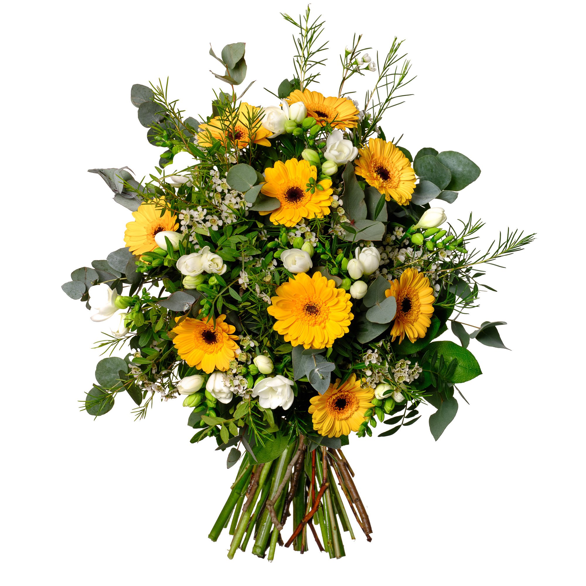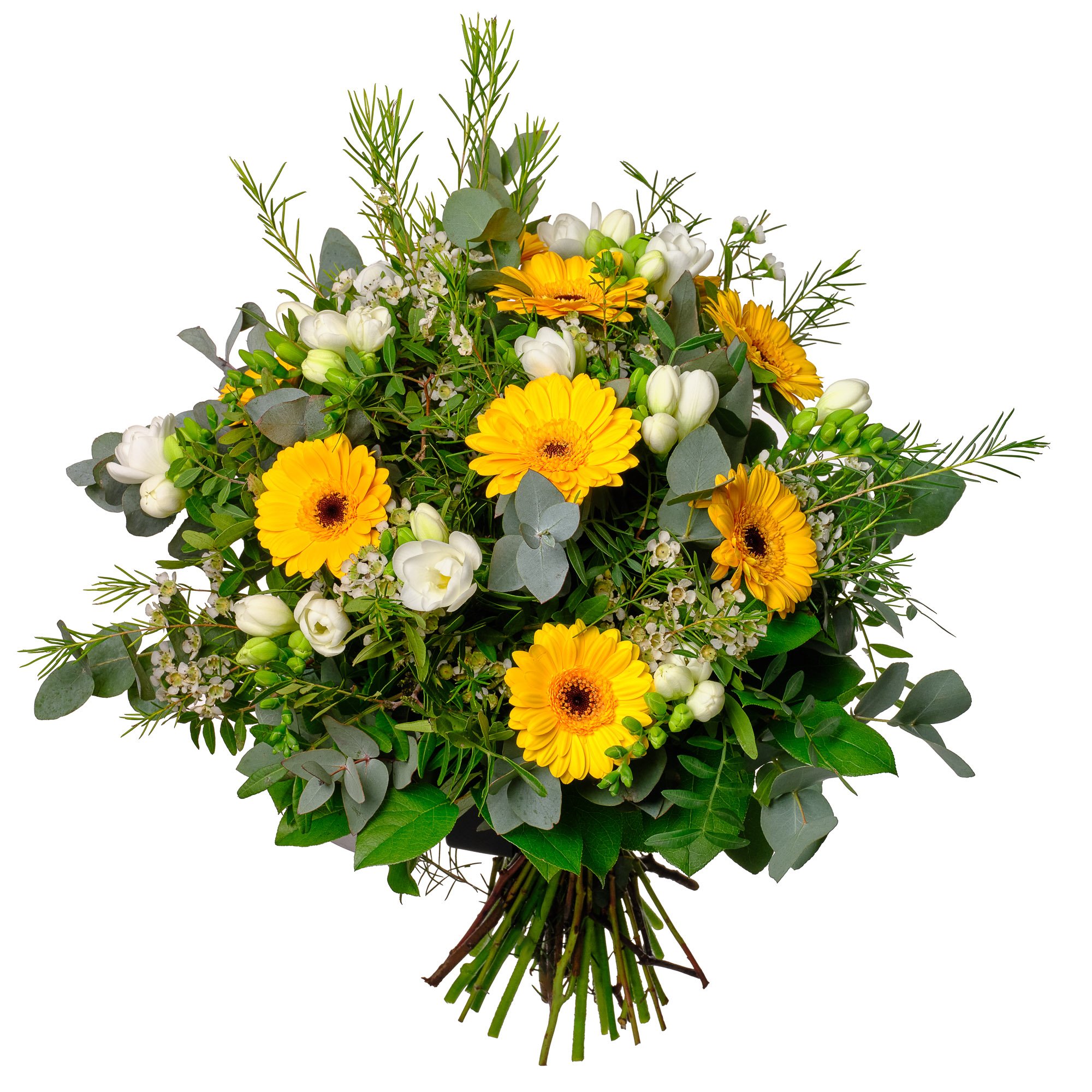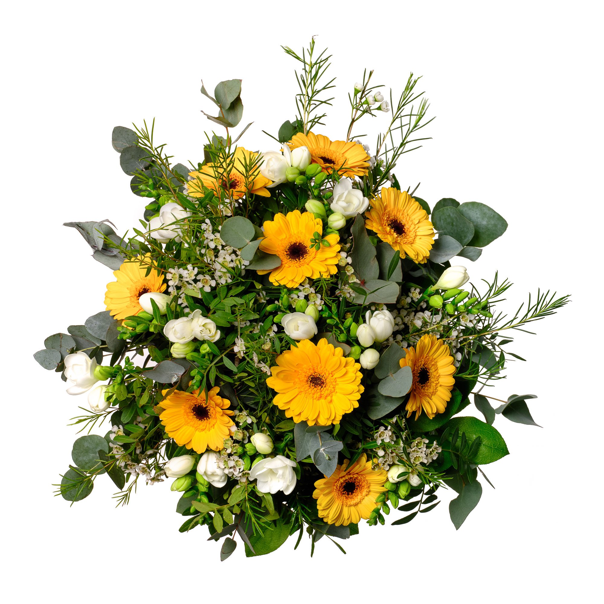 | Standardní | 5 ks gerbera mini, 7 ks frézie, 3 ks waxflower a dekorativní zeleň (pistacie, salal, eukalyptus) |