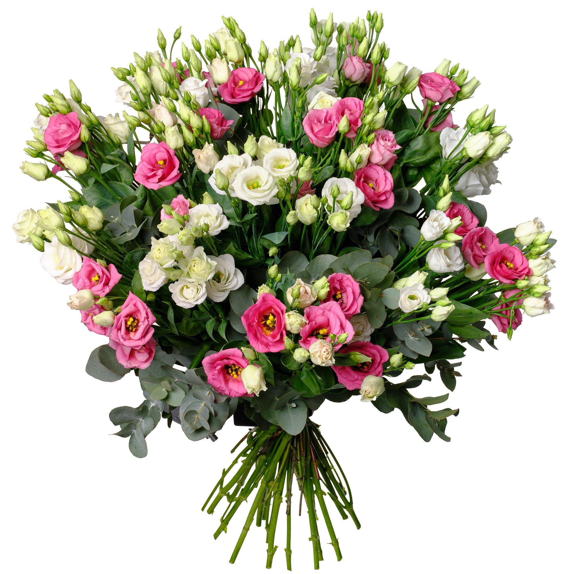 Exkluzivní 10 ks bílá eustoma, 10 ks růžová eustoma a dekorativní zeleň (eukalyptus)