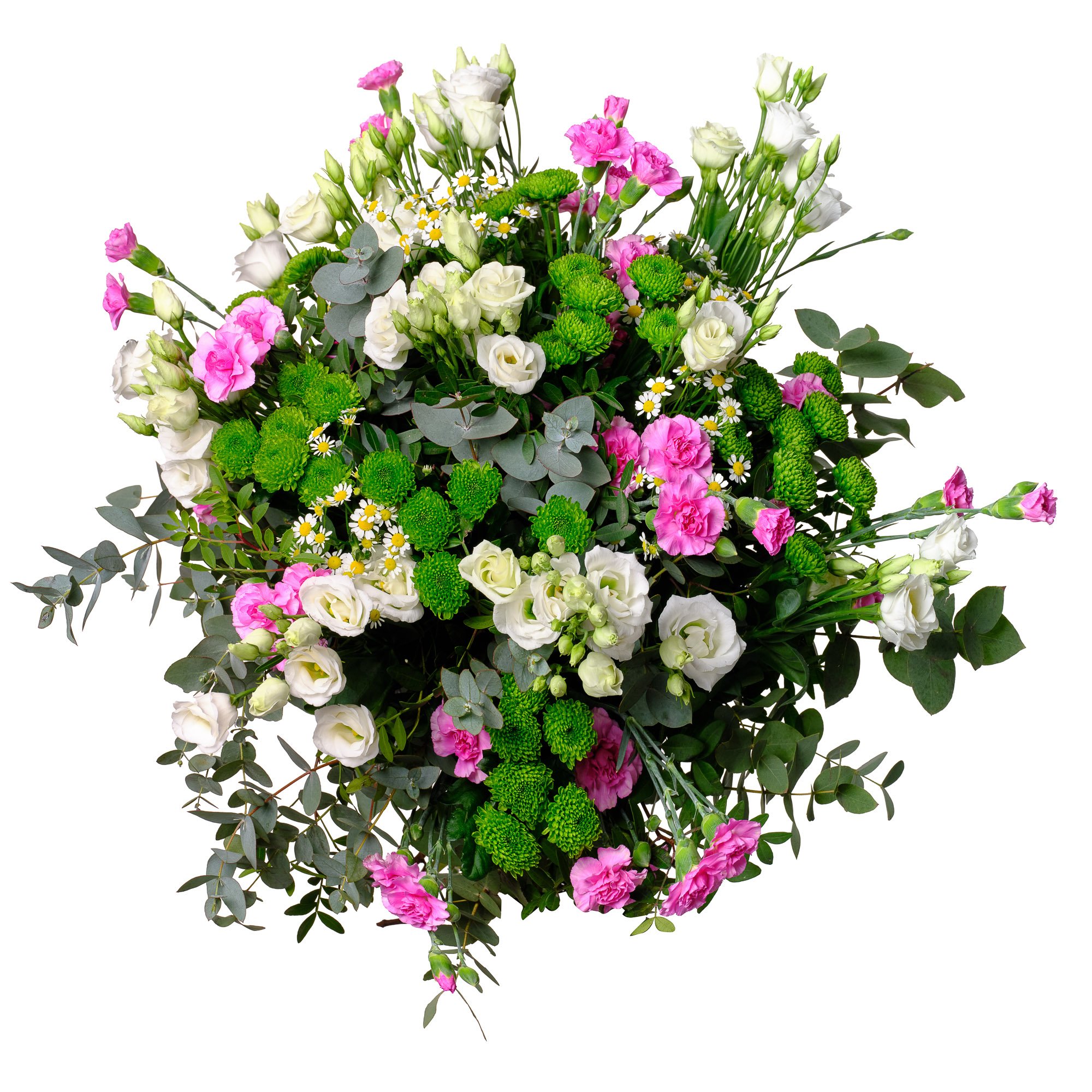 Exkluzivní 7 ks bílá eustoma, 10 ks růžový trsový karafiát, 7 ks santini, 3 ks heřmánek a dekorativní zeleň (pistacie, eukalyptus)