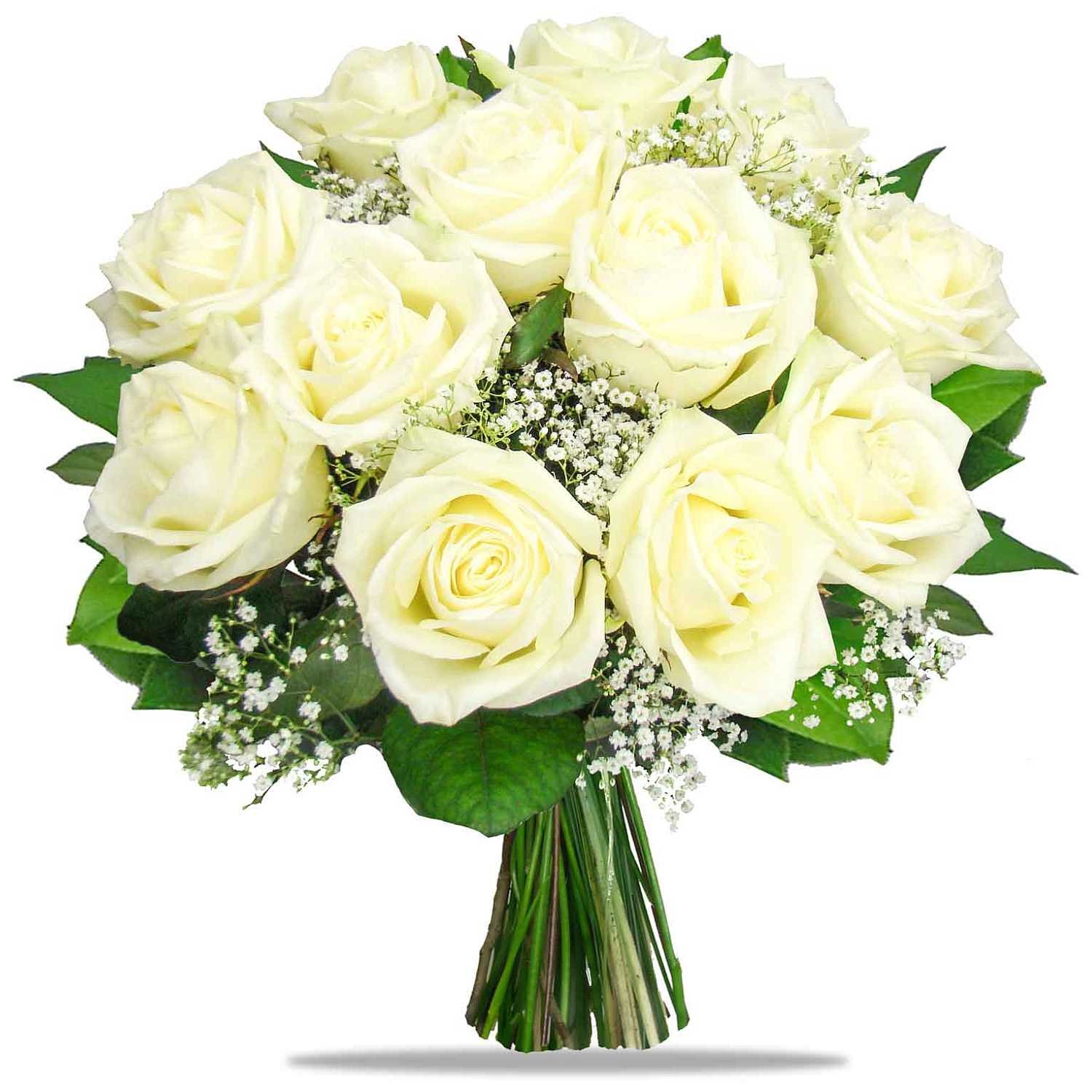 11 ks bílá růže, 2 ks gypsophila a dekorativní zeleň