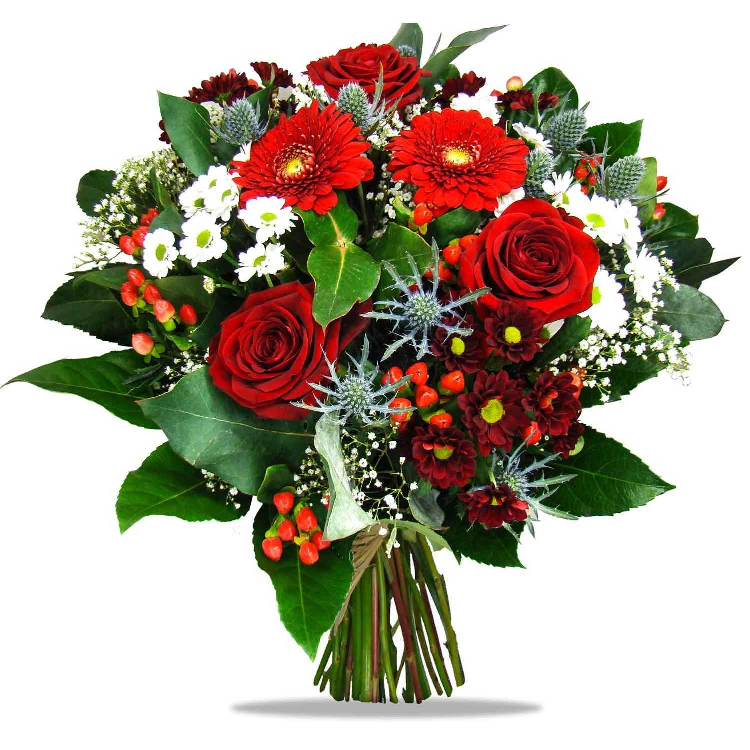 5 ks červená růže, 2 ks červená chrysantéma, 2 ks bílá chrysantéma, 5 ks germínka, 2 ks eryngium, 4 ks hypericum, 2 ks gypsophila a dekorativní zeleň (aralie, pistacie)