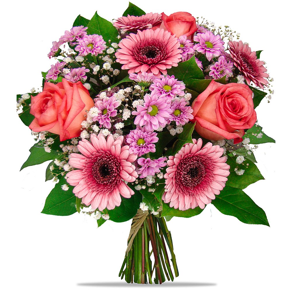 Velká 5 ks germína, 5 ks růže, 4 ks chrysantéma santini, 2 ks gypsophila a dekorativní zeleň (pistacie, salal)